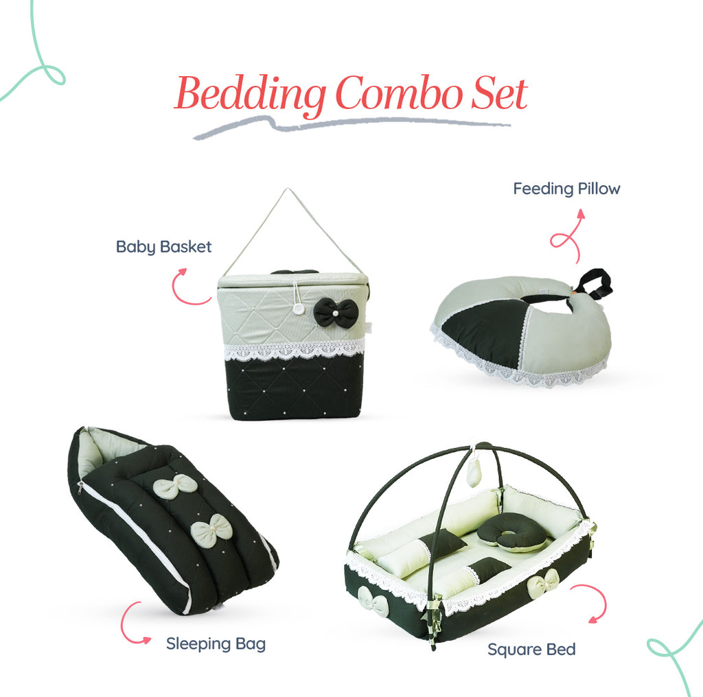 Adorables Baby Square Bedding Combo Set 4 in 1 | Light Green & Dark Green | Bow, Pearls & Lace Design | Cotton & Recron | Includes Square Bed, Sleeping Bag, Basket (L), and Feeding Pillow
