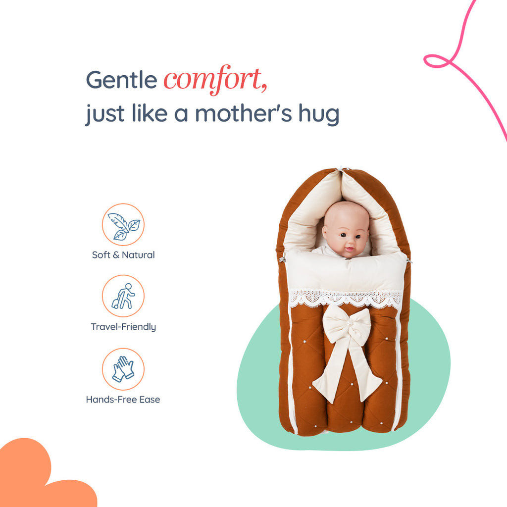 - A beautifully coordinated 4-piece baby bedding combo set in coffee and off-white featuring braided detailing, pearl and bow work, and lace design. Includes a baby nest, sleeping bag, large storage basket, and ergonomic feeding pillow.