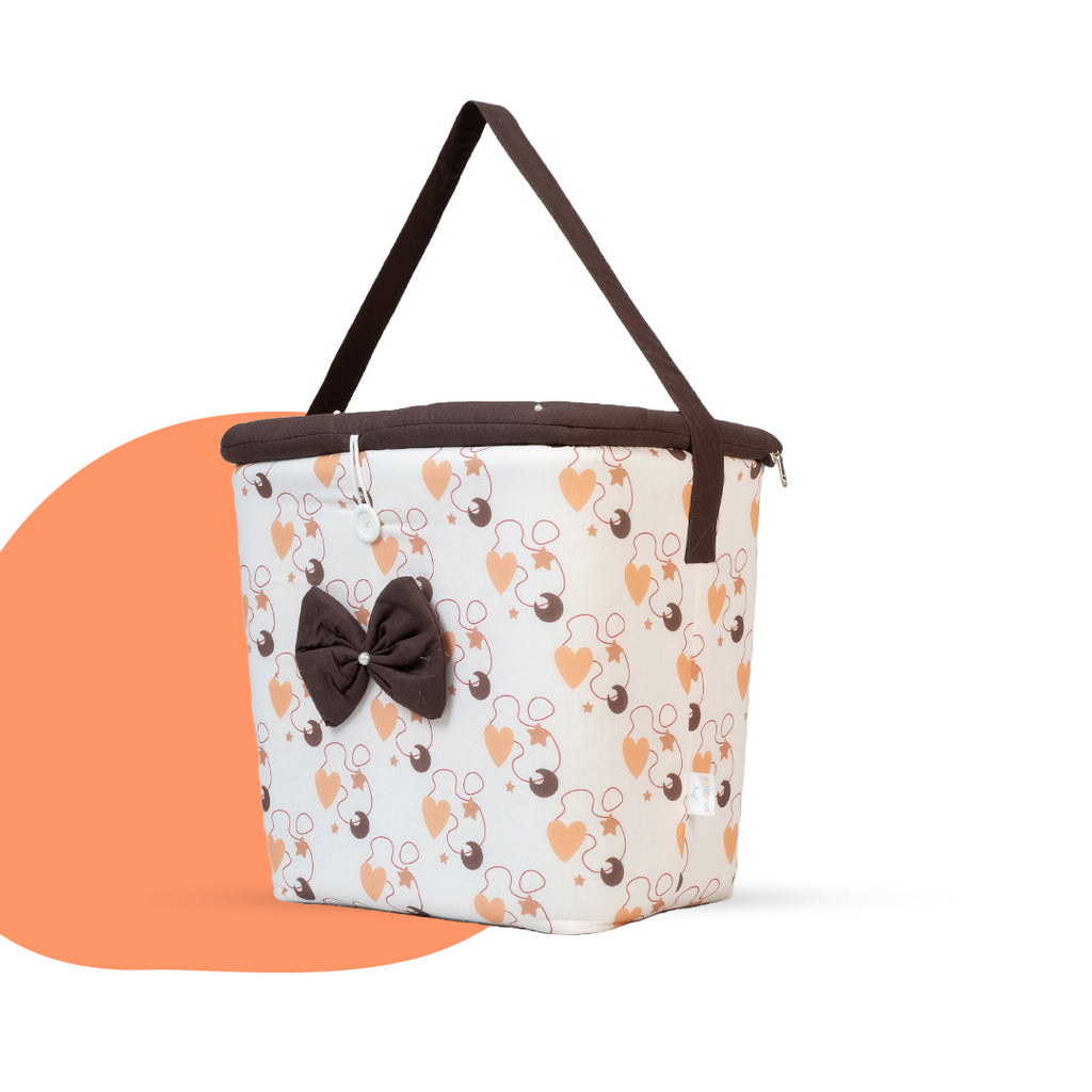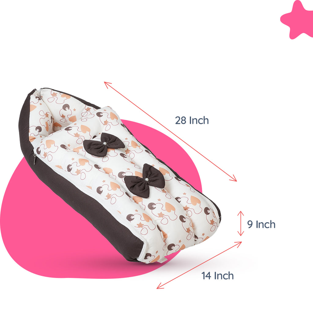 Adorables Baby Oval Bedding Combo Set 4 in 1 | Dark Coffee & White | Heart Print, Bow & Pompom Lace Design | Cotton & Recron | Includes Oval Bed, Baby Holder, Basket (L) & Feeding Pillow.