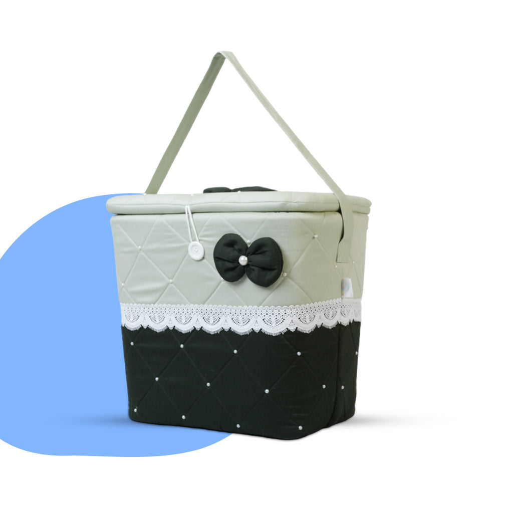 - A soothing 4-piece baby bedding combo in light and dark green with bow, pearl, and lace accents. Includes an oval bed, sleeping bag, large storage basket, and ergonomic feeding pillow. Made from breathable cotton and Recron for gentle comfort and practical support.
