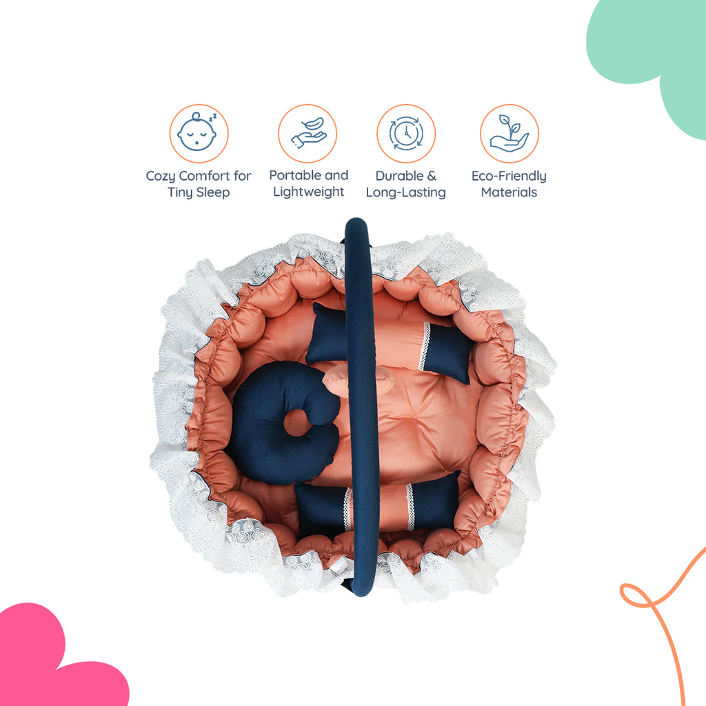Create a cozy, secure, and stylish space for your little one with the Adorables Baby Round Bedding Combo Set 3 in 1 in elegant turquoise blue & peach. This thoughtfully curated set includes a plush Round Bed with net and ergonomic pillows, a beautifully embellished Sleeping Bag with star bow work and pearl detailing, and a spacious Baby Basket for organized storage of baby essentials.